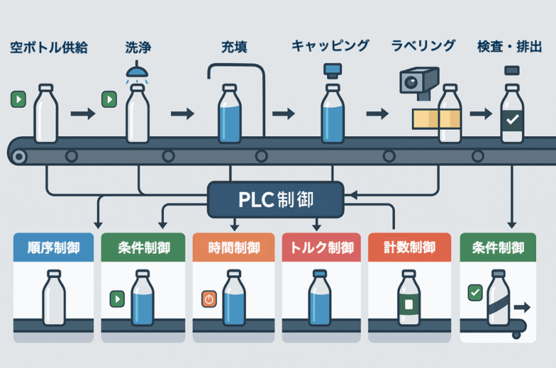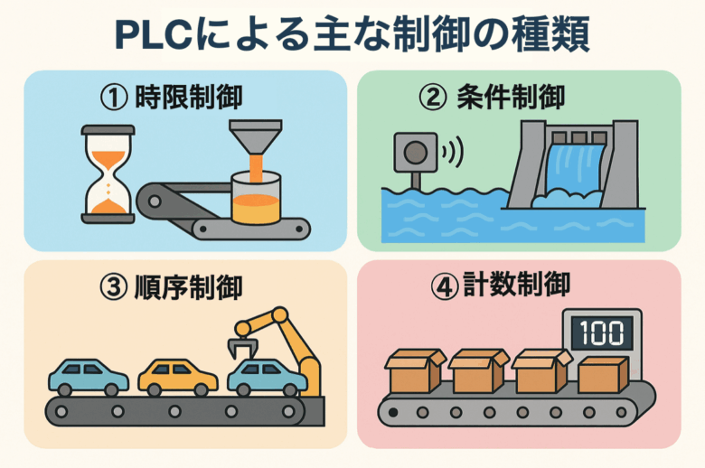 PLC(シーケンス)制御は、特定の条件や順序に基づいて機器を制御する方法です。主要な4種類として、時限制御、条件制御、順序制御、計数制御があります。
