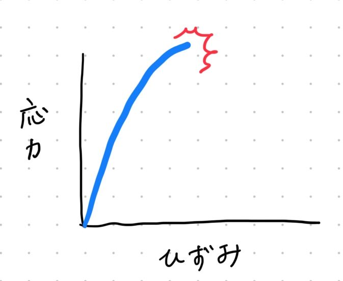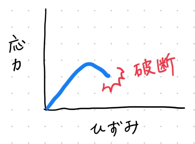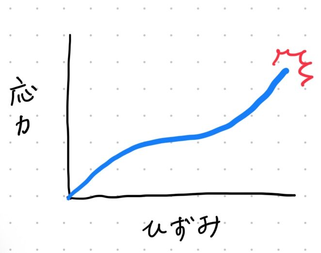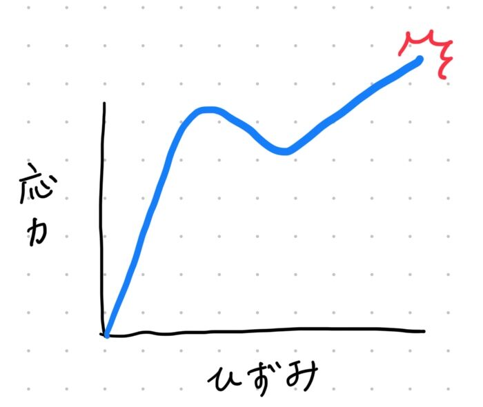 弾性域を超えて材料に力を加え続けると、応力があまり増加しない、あるいは一時的に低下するにもかかわらず、ひずみが急激に増加する点に達します。