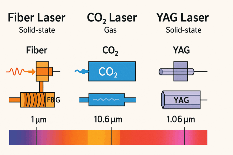 ファイバーレーザーは、光ファイバーを増幅媒体とする固体レーザーの一種で、CO2レーザーやYAGレーザーといった他の主要なレーザーと異なる特性を持っています。これらの違いを比較することで、各レーザーの得意な加工分野や用途が明確になります。