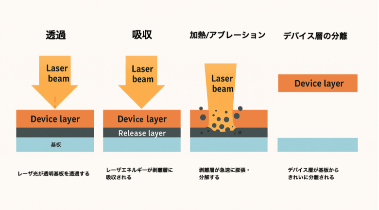 レーザが基板を透過して界面で吸収されることで、瞬間的な加熱や分解(アブレーション)が起こり、デバイス層が基板から非接触で分離されます。
