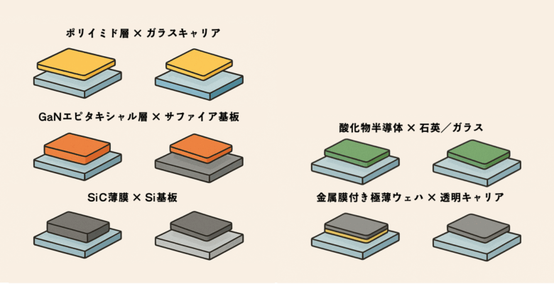 レーザリフトオフは、透明基板を透過したレーザ光が界面に吸収される性質を利用するため、基板がレーザ透過性を持つことが大前提となります。以下は代表的な組み合わせです。