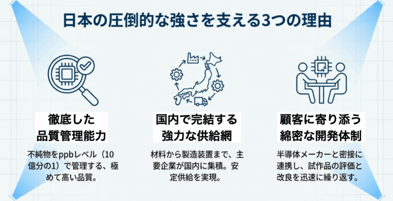 このように、材料から装置まで、関連するメーカーや工場が国内に集積していることで、企業間の緊密な連携が可能となり、高品質な製品の安定供給と迅速な開発が実現されています。