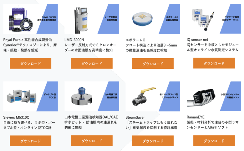 本ページでは、油膜検知器・高性能潤滑油・レーザ加工機・分析前処理装置など当社取扱製品に関する資料をご用意しております。